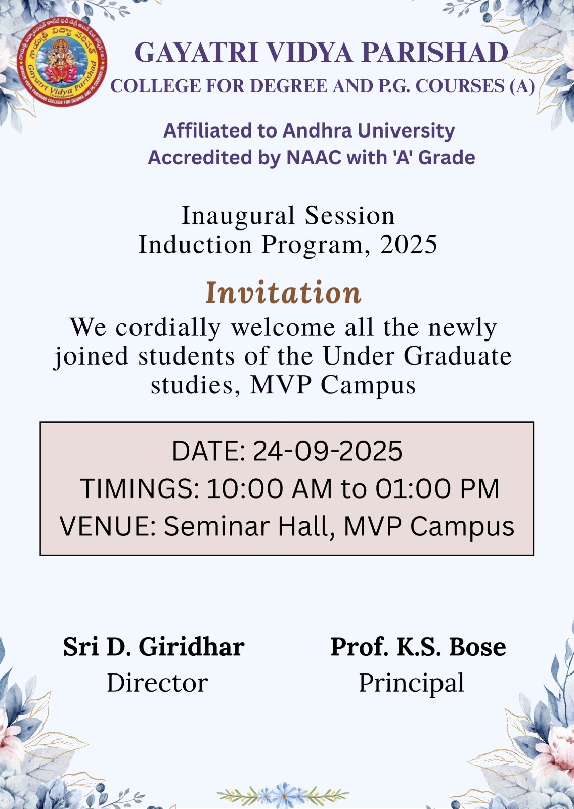 M.Tech Admissions 2025 - Key Benefits            "WORKSHOP ON COMPUTER HARDWARE AND WETWORKING"            "Inaugural Session Induction Program 2025-26"            "हिन्दी दिवस"            "Admissions Notice"            "తెలుగు భాషా దినోత్సవం"            "Certificate Course Invitation"            "Admissions are in Progress" - 2025-2026            "Hardware and Computer Networks Workshop" - 01-08-2025            A 5-Day English Workshop on "Basic Grammar for Effective Writing Skills" - 15.05.2025-19.05.2025            A Workshop on " Navigating GST " - 1.07.2025            Congratulations to Our Lifesciences APPGCET 2025 Rank Holders             A 7-Day Workshop on "Enriching Values Through Language Learning" - 15.05.2025-21.05.2025            Vibrance club 26-03-2025            Over 100 students of UG COURSES from Gayatri Vidya Parishad College for Degree and PG Courses (A) successfully completed the MongoDB certification 18-06-2025            Events Organized            GAYATRI VIDYA PARISHAD - NEWSLETTER            Examination (Circular & Time Tables)